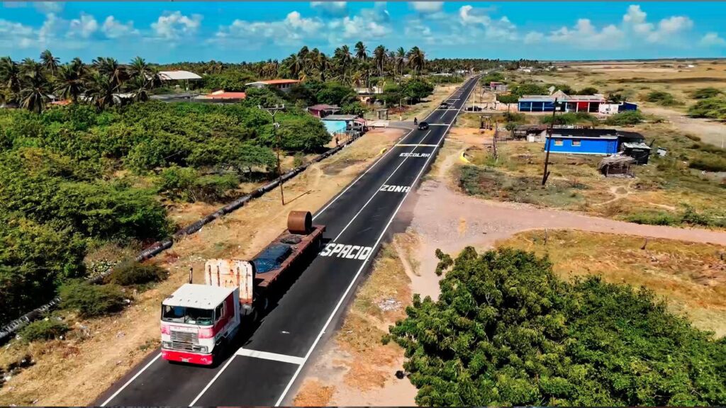 Luis Caldera destacó que en la rehabilitación se colocaron 58.000 toneladas de asfalto en caliente tipo III. La Troncal del Caribe forma parte de la red nacional de carreteras y atraviesa territorios ancestrales de los pueblos wayuu y añú.