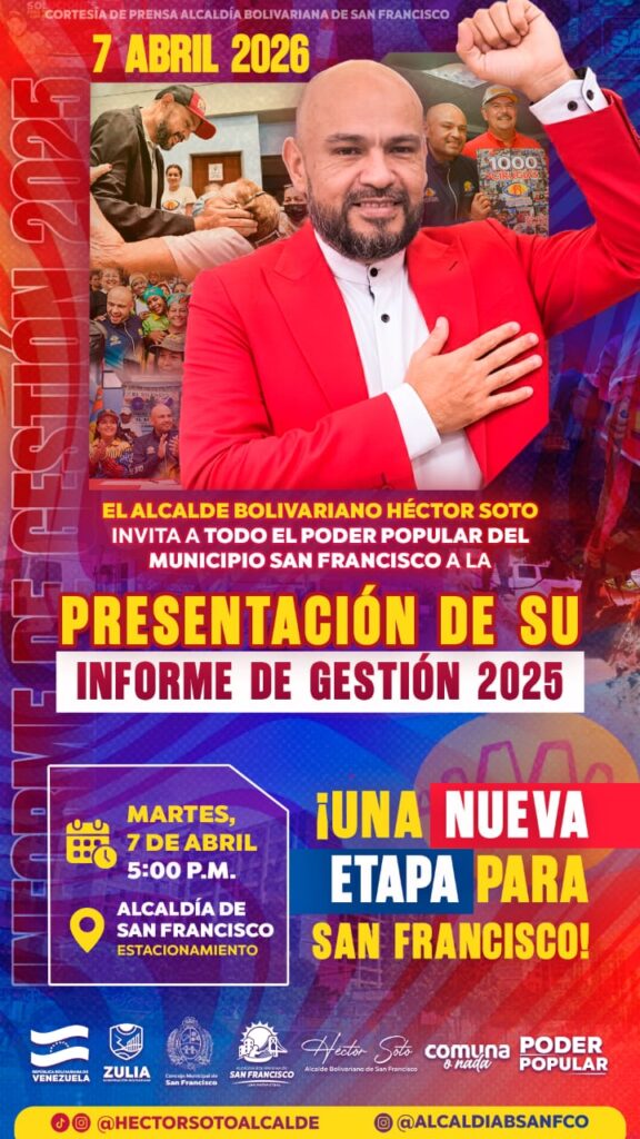 El Alcalde Bolivariano del municipio San Francisco, Lcdo. Héctor Soto, en cumplimiento de su deber constitucional y del compromiso asumido con el pueblo, invita a los medios de comunicación y periodistas a la Presentación del Informe de Gestión 2025.