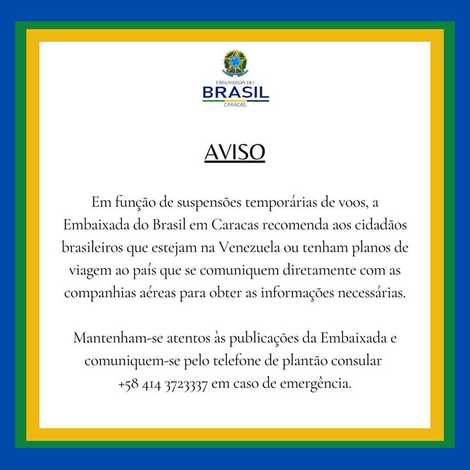 La embajada de Brasil en Caracas recomendó este jueves 27 de noviembre a “todos los ciudadanos brasileños que estén en Venezuela” que se comuniquen “directamente con las aerolíneas” para obtener “información necesaria”.
