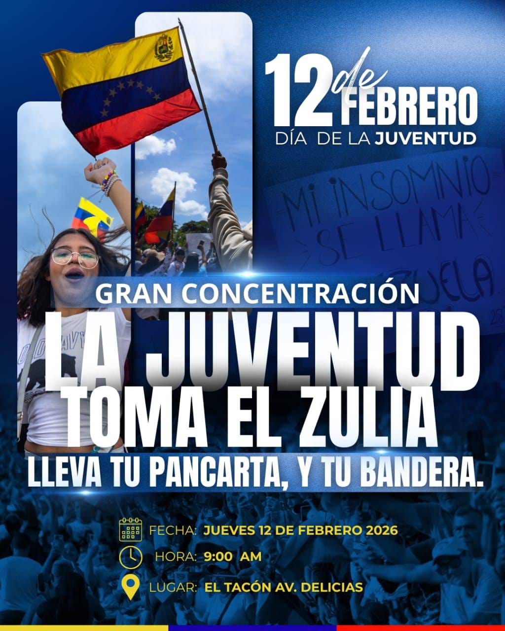 Los jóvenes del zulia, trabajadores, estudiantes y deportistas, celebran este 12 de febrero el Día de la Juventud a las puertas de una nueva democracia. El mismo, servirá para homenajear el prócer José Feliz Rivas y para exigir la libertad plena de todos los presos políticos, según voceros estudiantes de la Plataforma Unitaria Democrática zuliana.