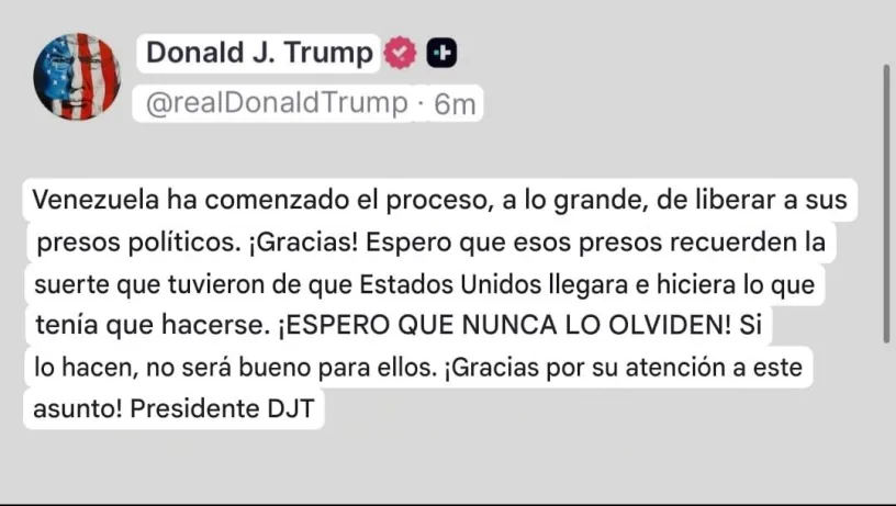 »Venezuela ha comenzado el proceso, a lo grande, de liberar a sus presos políticos. ¡Gracias! Espero que esos presos recuerden la suerte que tuvieron de que Estados Unidos llegara e hiciera lo que tenía que hacerse. ¡Espero que nunca lo olviden! Si lo hacen, no será bueno para ellos», sentenció el presidente Trump a través de sus canales oficiales.