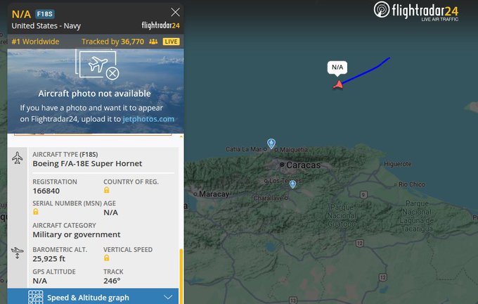 Una aplicación de vista de tráfico aéreo en vivo reportó el vuelo de dos cazas F-18 de la Fuerza Aérea de los Estados Unidos cerca de Maiquetía, estado La Guaira, la tarde de este jueves 18 de diciembre.